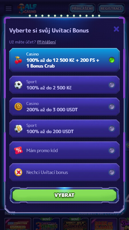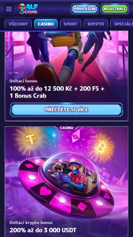 Noví zákazníci se můžou těšit na uvítací casino balíček. AlfCasino má pro nové hráče připravený bonus na první vklad ve výši 100% do maximální hodnoty 12 500 Kč. K tomu navíc můžete získat 200 free spinů a 1 Bonus Crab. Minimální vklad pro bonus je 500 Kč a pro Bonus Crab stačí jen 250 Kč. Wagering je 35x na peníze a 40x na free spiny. Také je možné zvolit uvítací krypto bonus pro vklady ve vybraných kryptoměnách. Získat můžete 200% ze vkladu, do výše až 3 000 USDT.