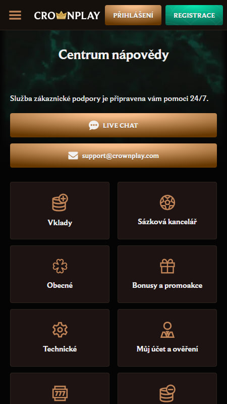 Díky podpoře se můžete spolehnout na to, že vás žádná situace nezastaví. Proto se díváme také na to, jak fungují zákaznické podpory v online casinech. Podporu CrownPlay jsme prověřili našimi testovacími otázkami a vždy nám odpověděla rychle a správně. Podporu můžete kontaktovat pomocí online chatu nebo emailem. Telefonická podpora není pro české hráče dostupná. Doporučujeme využívat online chat, který je dostupný 24/7 a reaguje velmi rychle.