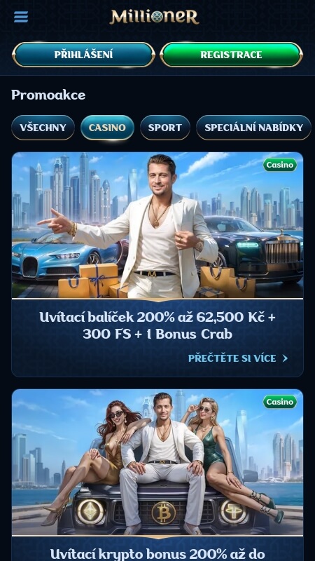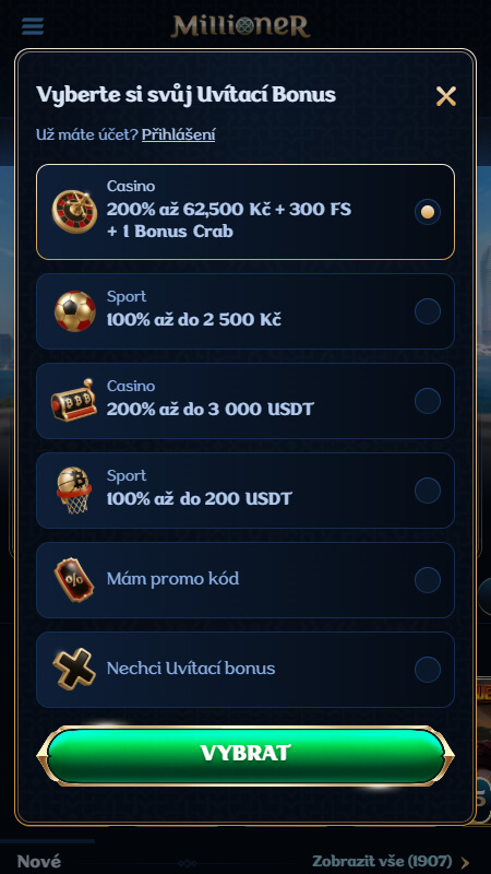 Pro nové zákazníky má Millioner opravdu vysoký uvítací bonusový balíček. Získat můžete až 62 500 Kč na první vklad (bonus 200% vkladu) a aby to nebylo málo, tak k tomu dostanete ještě až 300 free spinů a 1 bonus crab. Minimální vklad je 500 Kč. Maximální částku 62 500 Kč můžete získat na první 3 vklady. První 2 vklady mají bonus 50% a třetí vklad 100%. Nebo se můžete rozhodnout pro uvítací bonus v kryptu. Získat je možné až 3 000 USDT. Minimální vklad pro bonus je 100 USDT. Získat můžete 200% bonus na váš první vklad.