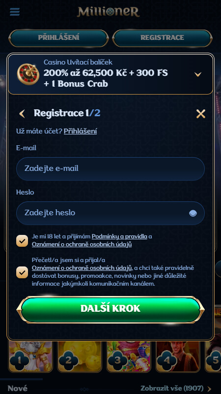Pokud si chcete založit herní účet v kasinu Millioner, stačí projít jednoduchým plně online procesem, díky kterému si účet vytvoříte během chvíle. Ukážeme si, čím je potřeba projít: