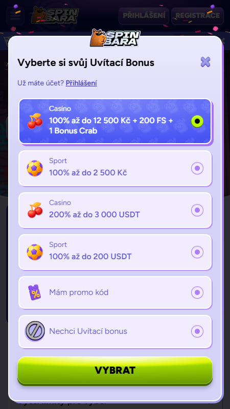 | 💰 Uvítací bonus | Balíček 100% až 12 500 Kč + 200 free spinů + 1 Bonus Crab nebo 200% až 3 000 USDT na krypto |