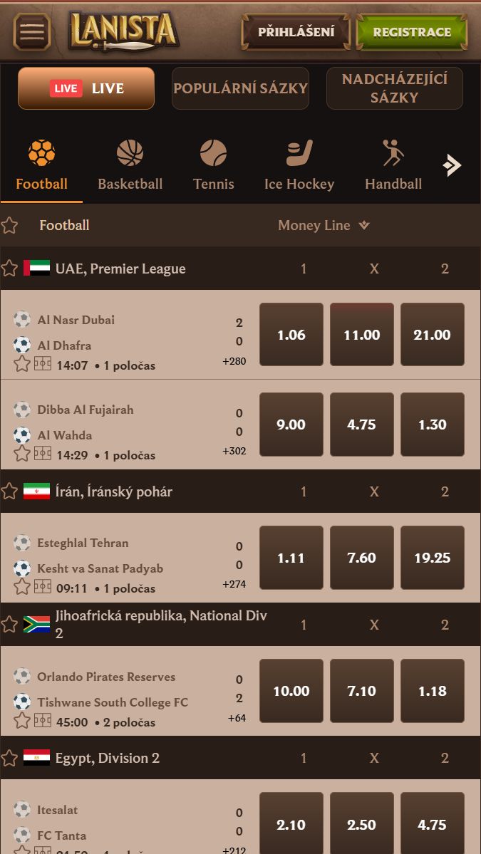 Odhadnout tuto situaci je klíčové a proto jsou live sázky ideální pro fanoušky sportů, kteří zároveň sledují živé přenosy. Načasování je nutné, Lanista může kdykoliv uzavírání sázek přerušit nebo zcela zastavit. Mezi sporty s dostupností v live sekci spadají například kategorie: