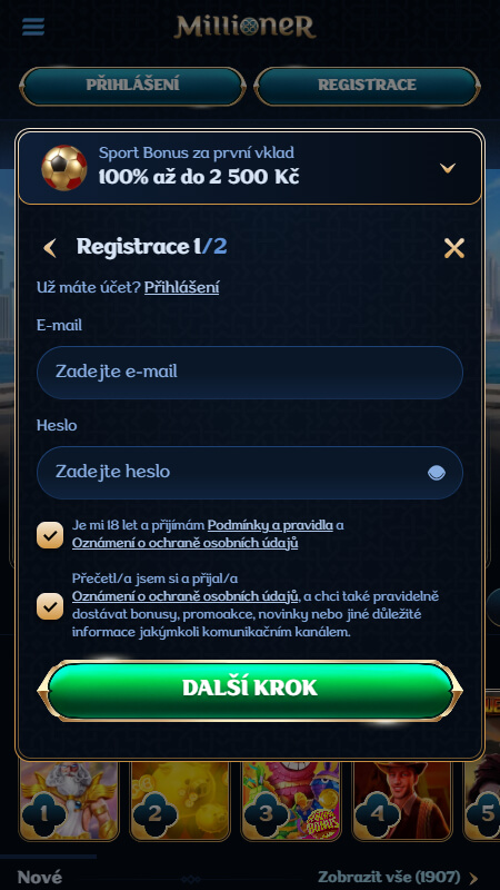 Vyplňte e-mail a heslo, které budou sloužit pro potřeby přihlášení. Následně je důležité si přečíst podmínky a udělit s nimi souhlas před kliknutím na “Další krok”.