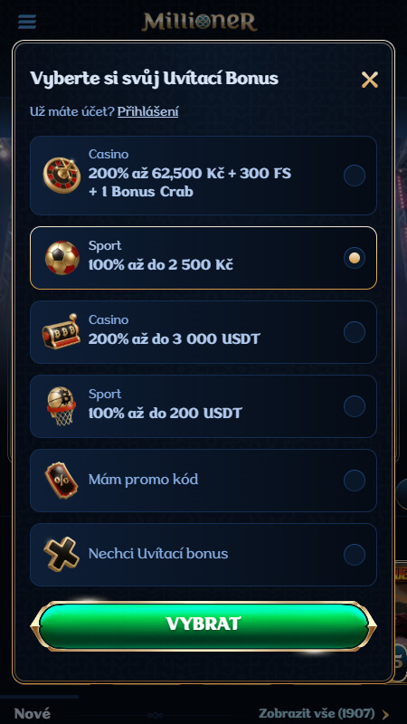 Vyberte si z preferovaného sportovního bonusu pro nové sázkaře nebo pokračujte bez bonusu a klikněte na “Vybrat” pro další krok.